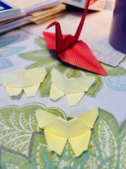 My mom introduced me to origami with cranes, and she taught me how to make them because when she was in school, she made 1000 paper cranes after September 11th. I remember that day she taught me how to make them. I made one really good one, and never made another good one again. Even now, they always look uneven.